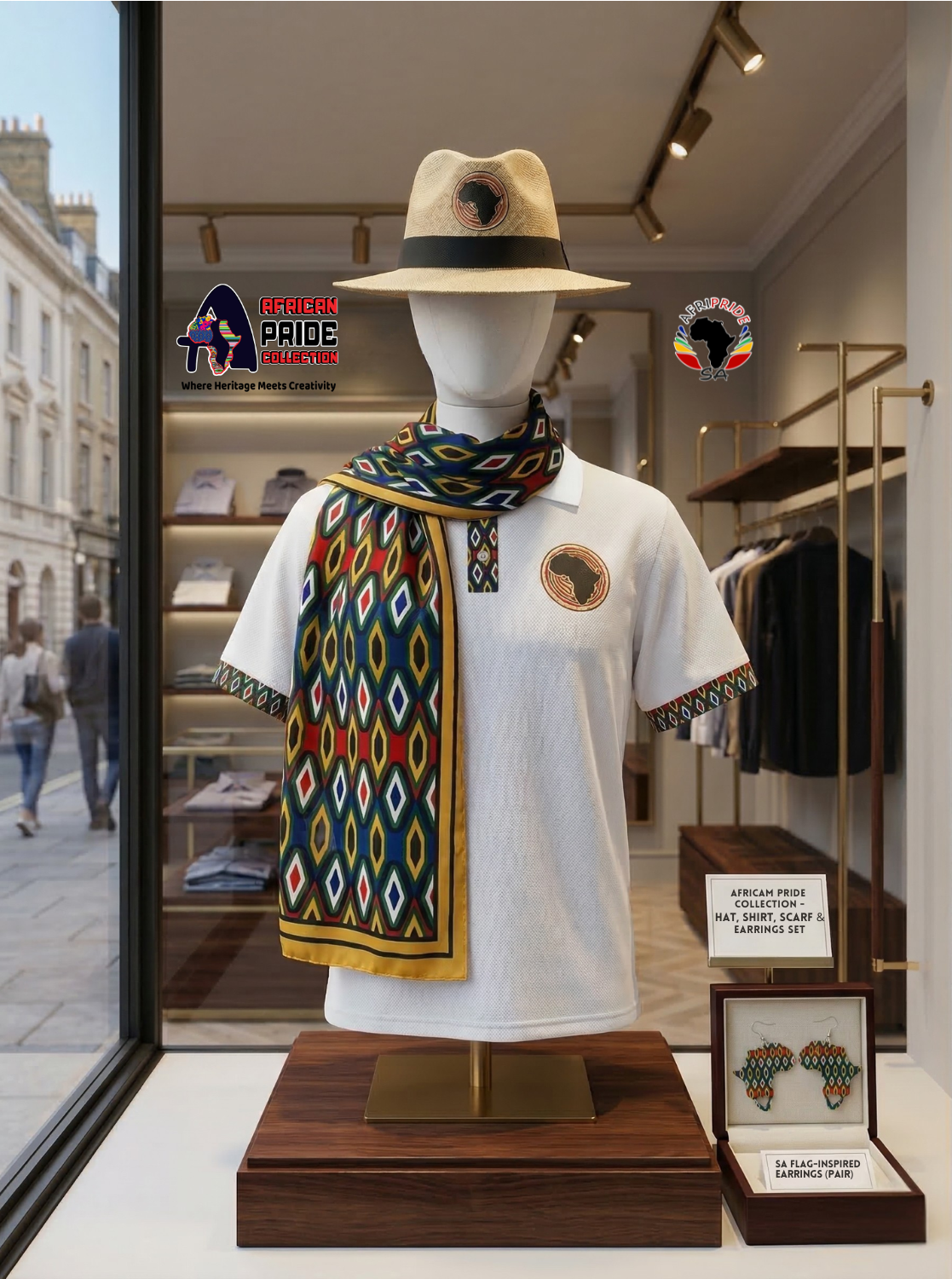 Pair this scarf with a clean white golf shirt and Africa map earrings — simple base, strong identity. That’s how you build a recognisable look.